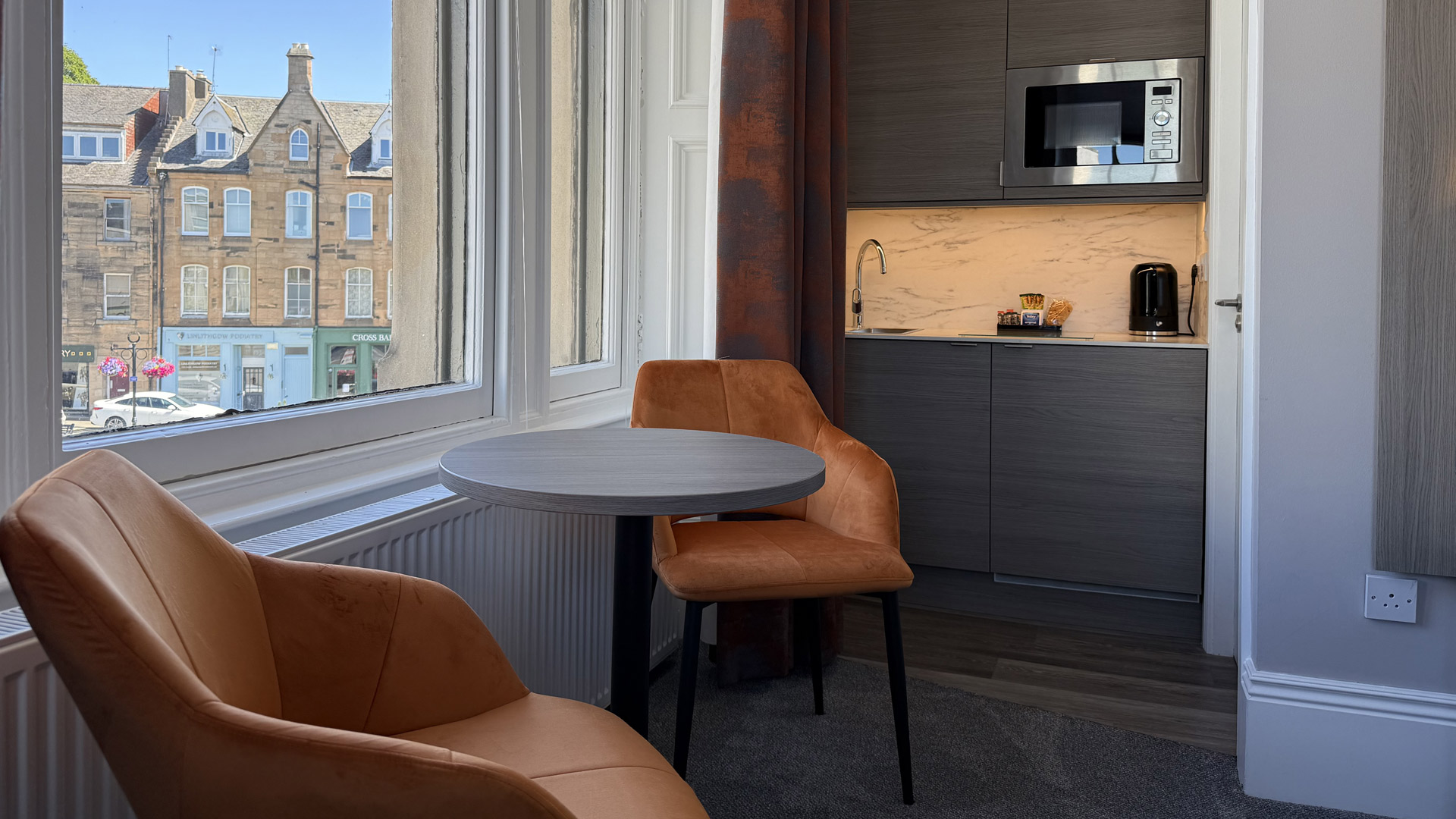 Linen Bank Residence is a three-storey former British Linen bank located on the cobbles, right in the centre of our busy historic town of Linlithgow. Our 21 contemporary Aparthotel Studios and Rooms come with fast free Wi-Fi, stimulating rain showers, compact kitchenette, free parking and 24/7 bean to cup coffee station. Wind your way up our traditional staircase to admire the magnificent views looking up the Kirkgate to St Michael’s church with its iconic spire and the Palace, birth place of Mary Queen of Scots. Linlithgow is close to both Edinburgh and Glasgow and has world famous attractions on our doorstep. Edinburgh Airport a mere 9 miles, while Stirling is just 16 miles away.